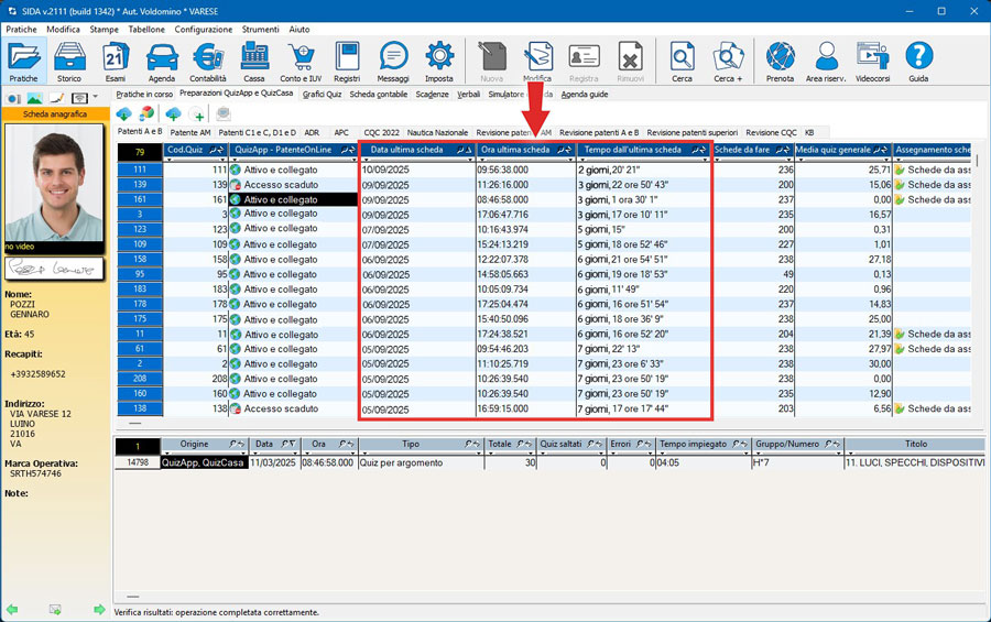 - Scarico schede QuizApp: Nella sezione “Preparazioni QuizApp e QuizCasa” sono state aggiunte 3 colonne che mostrano in che data ed orario il candidato ha svolto l’ultima scheda quiz e quanto tempo è trascorso (“Data ultima scheda”, “Ora ultima scheda” e “Tempo dall’ultima scheda”). In questo modo è possibile sapere se il candidato si sta esercitando.