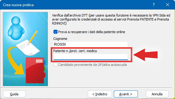 - Pratica di rinnovo CQC: quando si crea una pratica di rinnovo CQC, contestuale a rinnovo patente, è stata aggiunta la possibilità di recuperare i dati del candidato tramite numero di protocollo certificato medico. In questo modo verranno recuperati anche foto e firma.