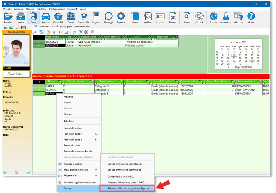 - Prenota esami: Aggiunta la possibilità di stampare il modulo “Attestato di frequenza guide obbligatorie” direttamente dalla sezione “Esami”. Per farlo cliccare su una seduta di guida e poi sulla prenotazione di un candidato e selezionare il menù "Stampe".