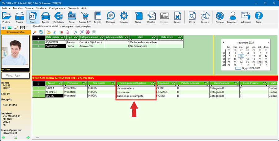 - Prenota esami: nella sezione “Esami” --> “Calendario esami e verbali” per le sedute di guida è stata aggiunta la colonna “Stato guide obbligatorie”; gli stati possibili in questa colonna sono “Da trasmettere”, “Trasmesse”, “Trasmesse e stampate”. Lo stato può essere modificato trasmettendo le guide obbligatorie oppure sincronizzando le prenotazioni.