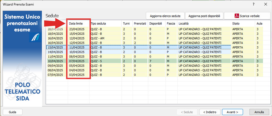 - Prenota esami: in fase di prenotazione, quando vengono mostrate tutte le sedute disponibili è stata aggiunta la colonna "Data limite" che mostra entro quando è possibile prenotare quella seduta di teoria e/o pratica.