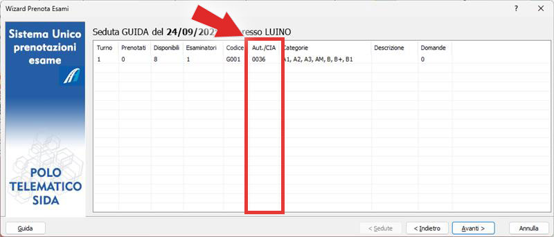 - Prenota esami: effettuando una prenotazione esami, quando si seleziona una seduta di guida tra quelle disponibili, verrà mostrata anche la colonna "Aut./CIA"; questo perché le sedute proposte possono essere anche condivise ma solo un turno è disponibile per l'autoscuola.