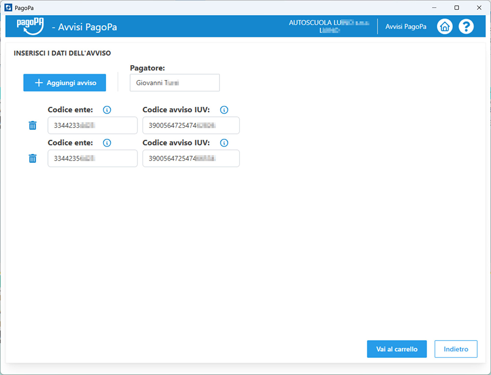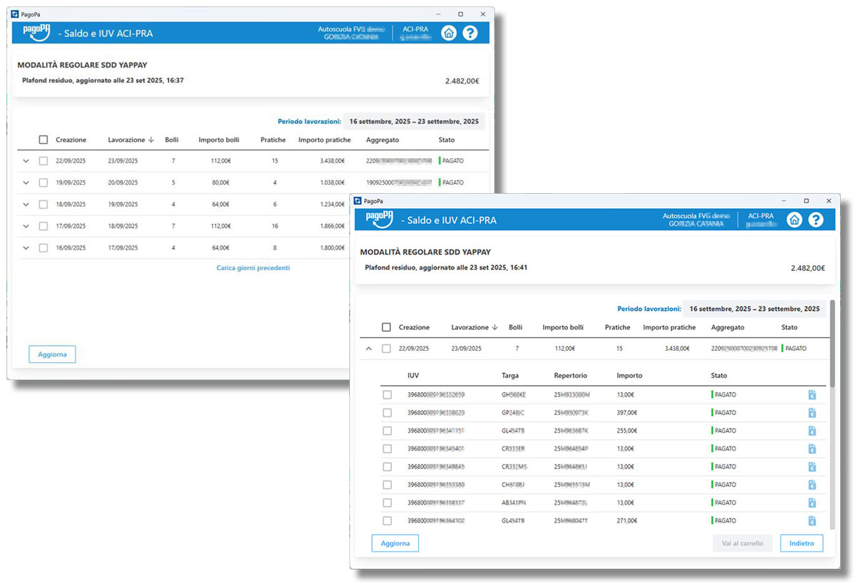 - IUV ACI/PRA: aggiunta la possibilità di gestire i pagamenti dei diritti ACI-PRA per le autoscuole che sono anche agenzie.