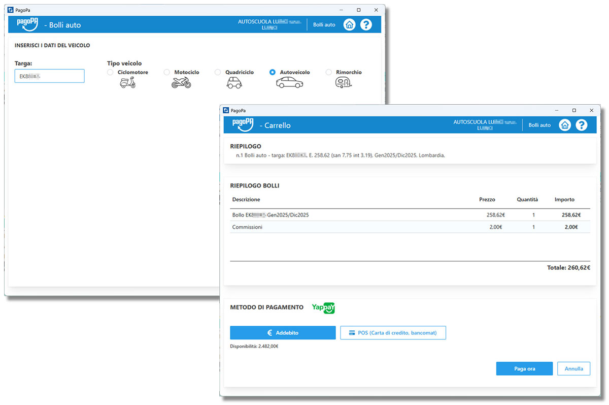 Dalla schermata home di pagoPA basterà cliccare sul pulsante "Bolli auto", inserire la targa e il tipo veicolo; cliccando su "Vai al carrello" il gestionale calcolerà in automatico la quota da pagare. Al termine dell'operazione va stampata la ricevuta PSP da consegnare al pagante.